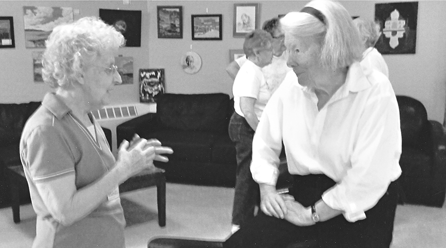 Sister Joan Schafhauser (left) speaks with a member of her fitness class, Kingston, May 2014. (SOSA 9-06.55-1-12)